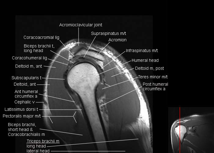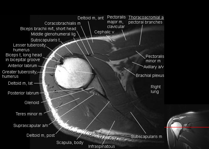 T1 sequence permits optimal visualization of the ant. inf. labral lig. complex (attaches to labrum)