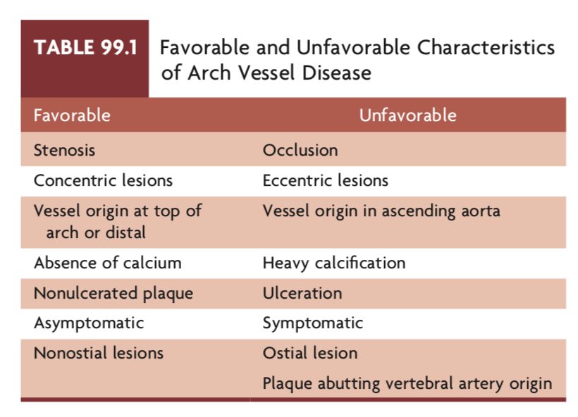 Name 7 “high risk”/unfavourable characteristics of arch vessel disease for endovascular treatment