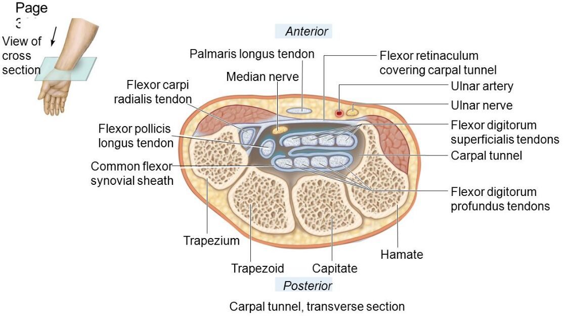 4 FDS tendons, 4 FDP tendons, FPL tendon, median nerve bordered by scaphoid and pisiform
