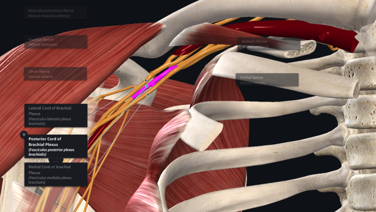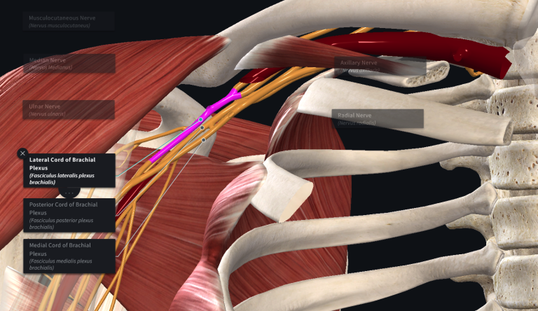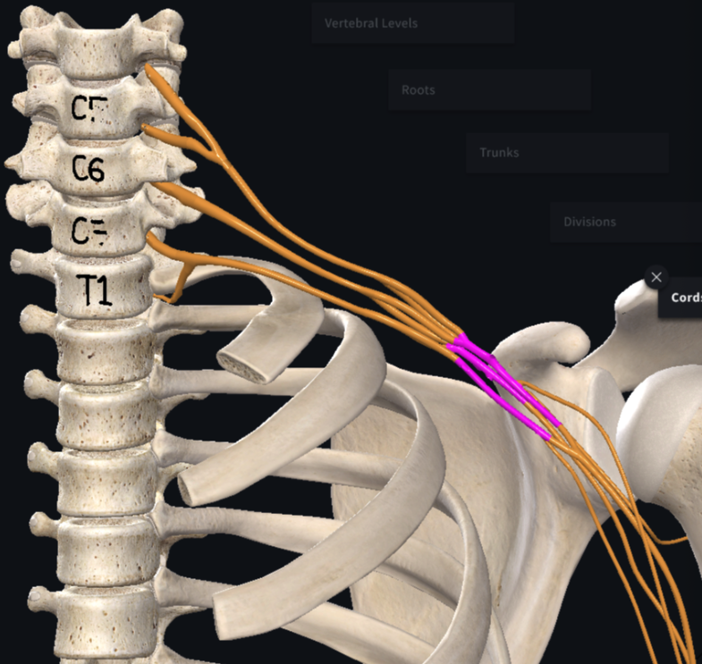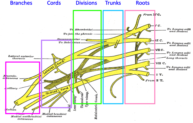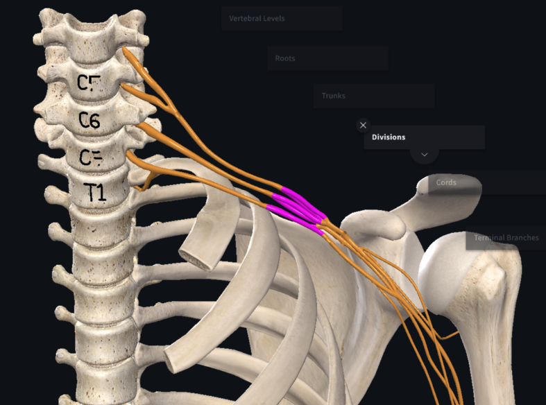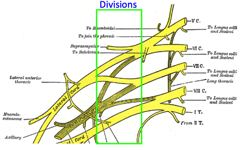 identify the divisions of the brachial plexus, their trunks, and their cords
