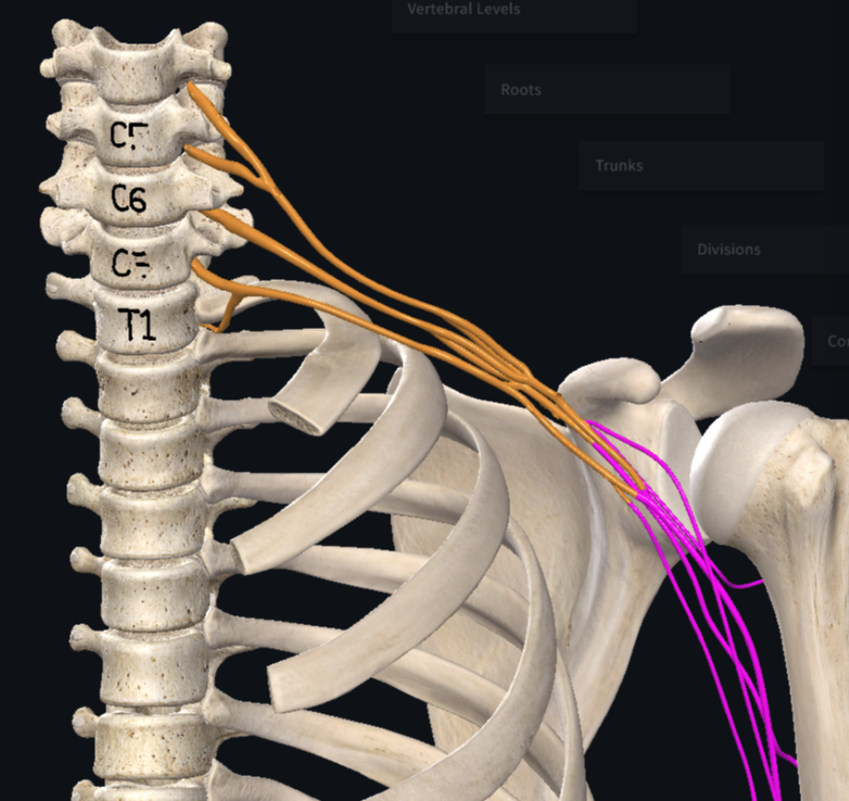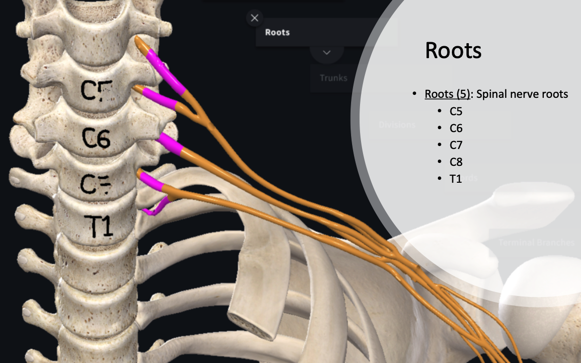 identify the brachial plexus branches (associated with attached to the spine)