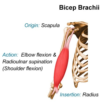 Name the biceps brachii muscles: origin and insertion