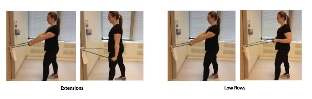 standing theraband extensions/rows (low level)