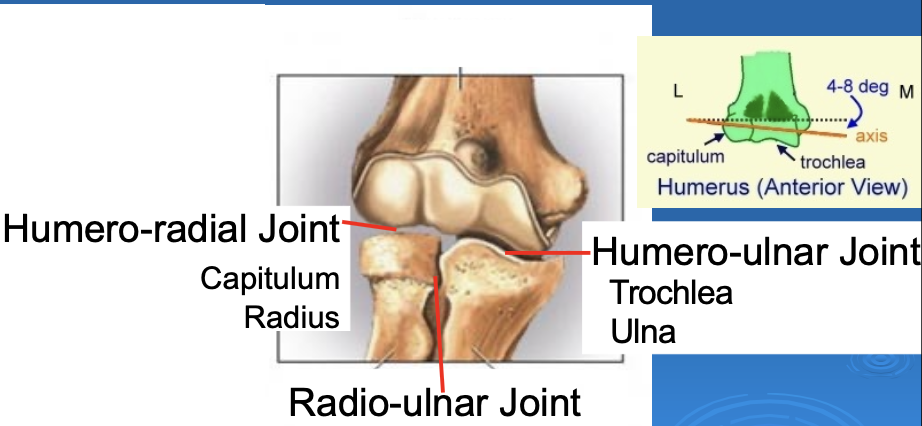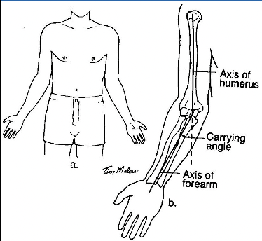 carrying angle: angled formed by the long axis of humerus and midline of the forearm, larger angles are considered abnormal