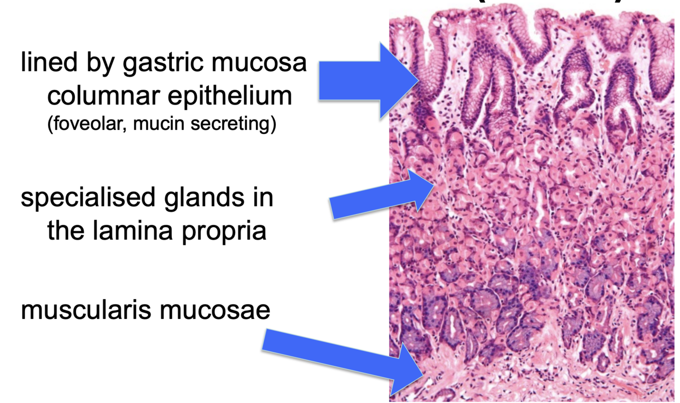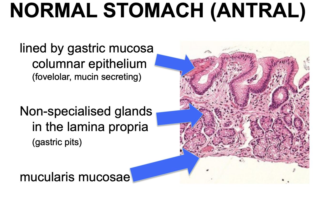 What is the normal histology of the gastric antrum?