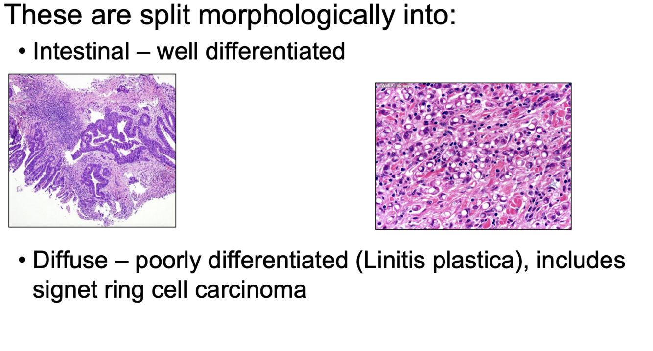 1. Intestinal (well-differentiated, goblet cells present –> following intestinal metplasia or)