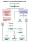 Management - type of bleeding: Endoscopic hemostasis + IV proton pump inhibitor + eradication of H. pylori + discontinuation of NSAIDs/anticoagulants