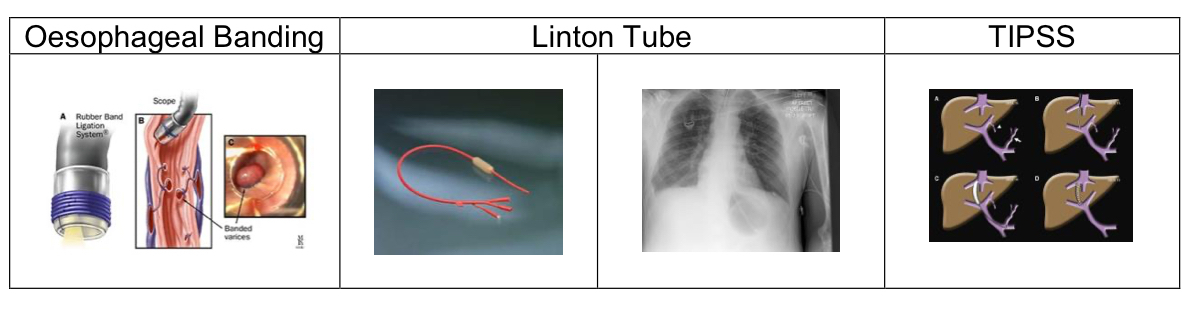 11 - If endoscopic control fails, surgery or emergency mesenteric angiography/embolisation may be needed. Sengstaken-Blakemore tube can compress varices.