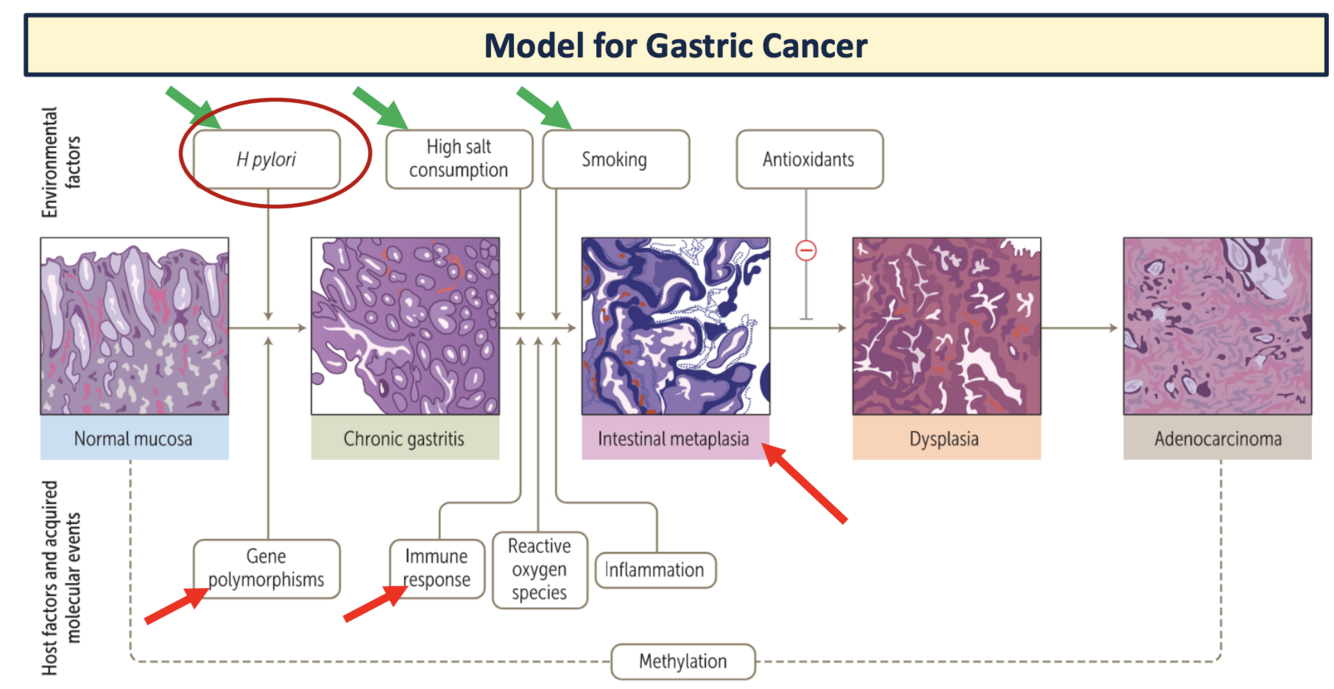Normal mucosa –> (H. pylori) –> chronic gastritis –> intestinal metaplasia –> dysplasia –> adenocarcinoma
