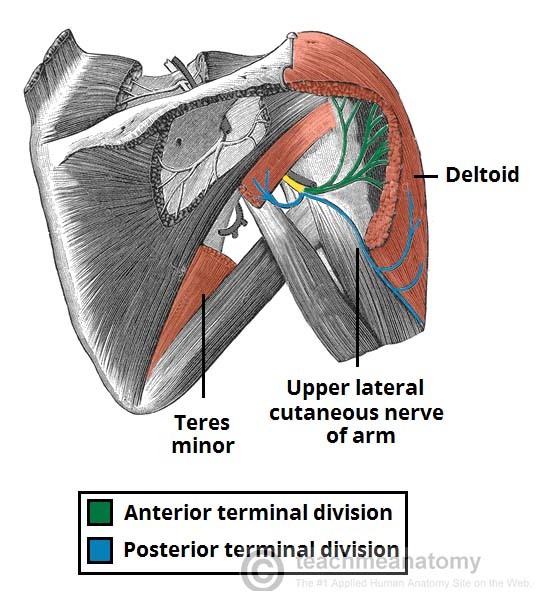 The deltoid, teres minor, and region of skin in upper lateral arm