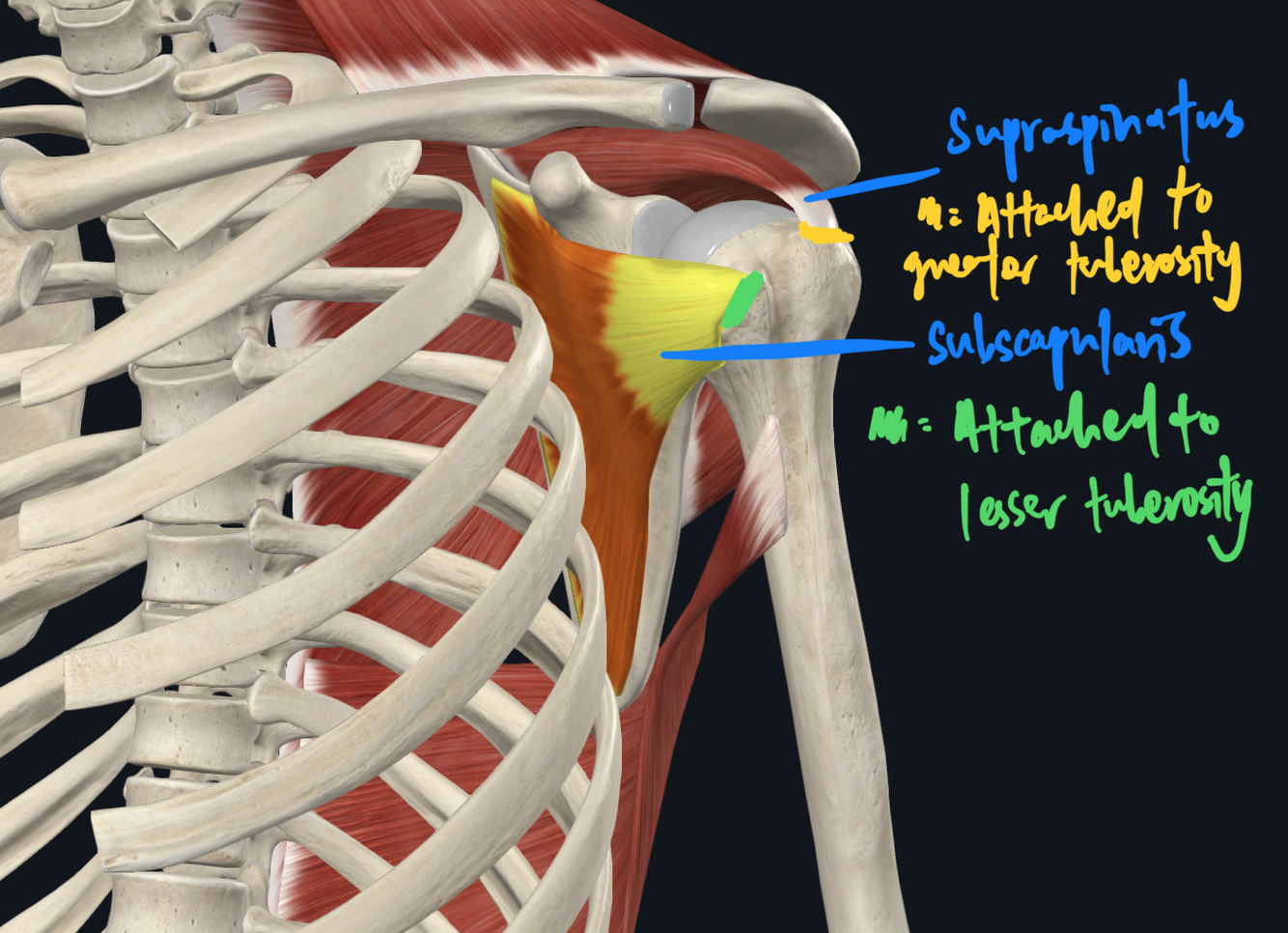 - 4 muscles = SUBSCAPULARIS, SUPRASPINATUS, INFRASPINATUS, TERES MINOR