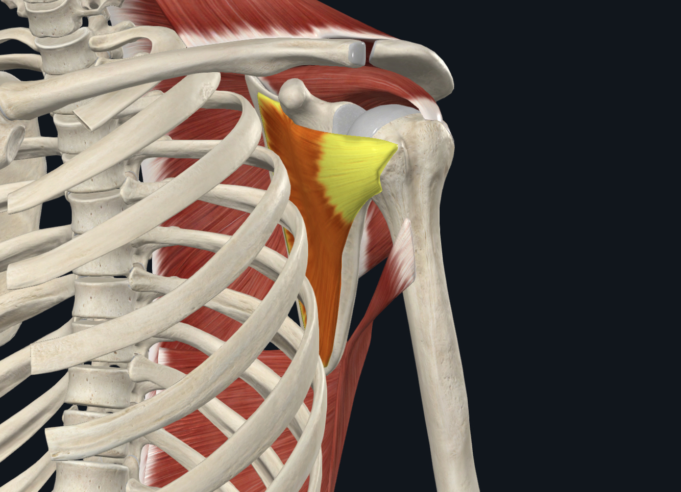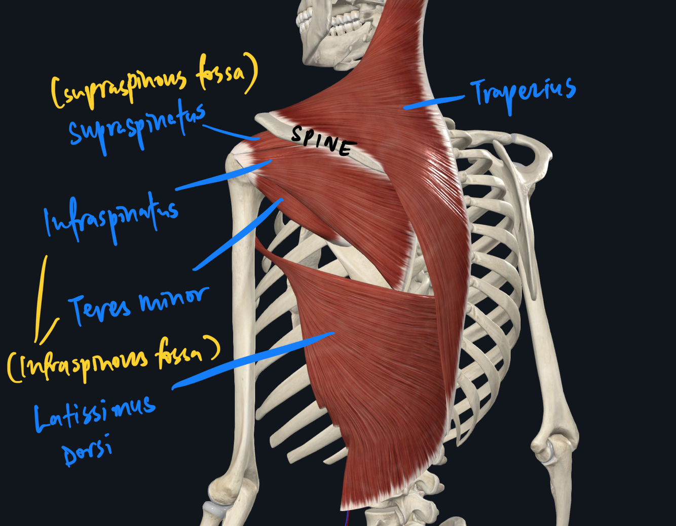 - 4 muscles = SUBSCAPULARIS, SUPRASPINATUS, INFRASPINATUS, TERES MINOR