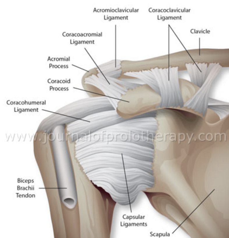 Name the 5 ligaments that strengthen and support the shoulder joint.