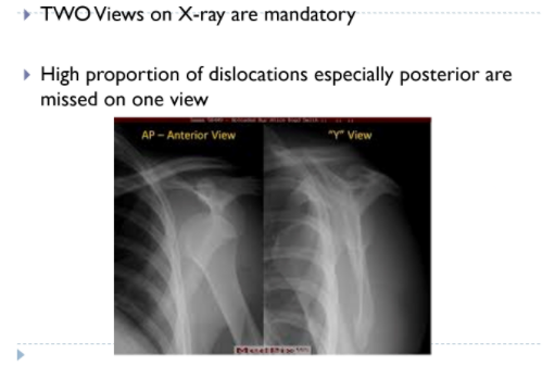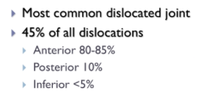 •Most are anterior dislocations – glenoid posterior and humeral head anterior to the scapula