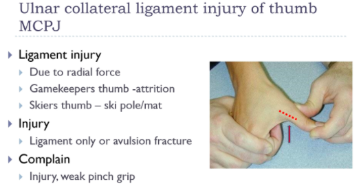 what is an ulnar collateral ligament injury of the thumb MCPJ caused by and what do patients complain off?