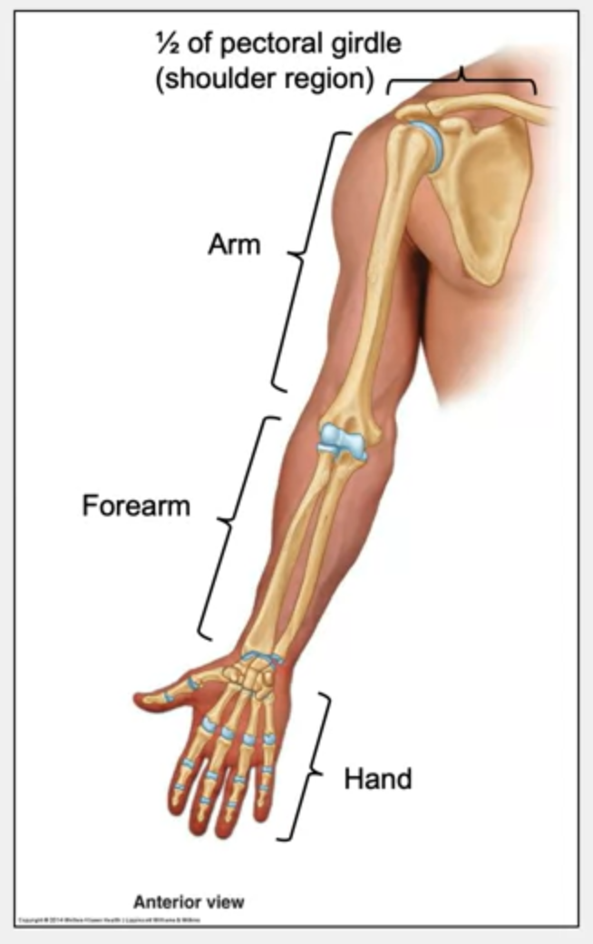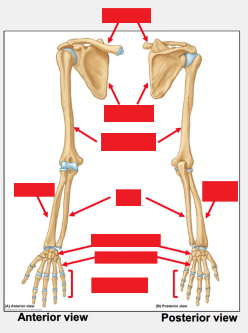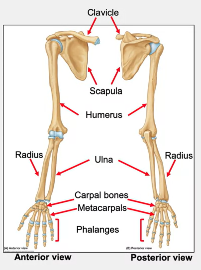 Clavicle, scapula, humerus, radius, ulna, carpal bones, metacarpals, phalanges