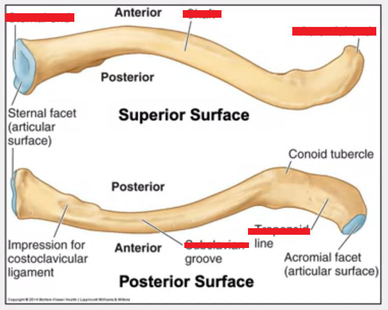 Fill in the covered labels on this skeletal diagram of the clavicle: