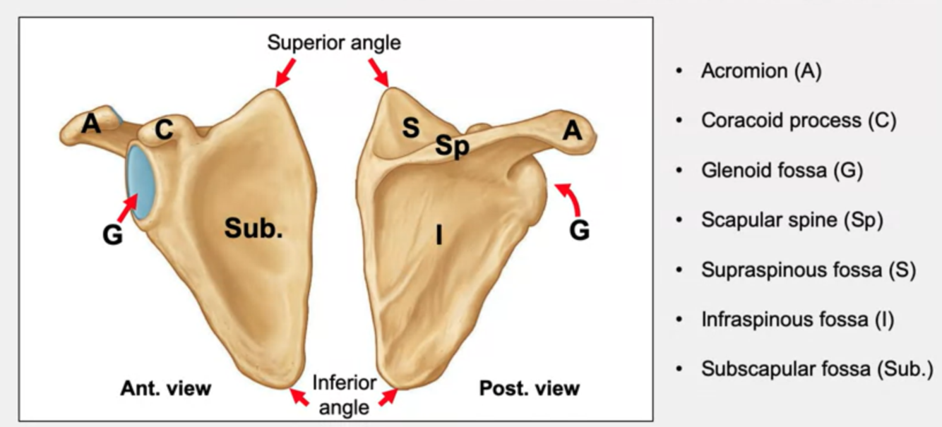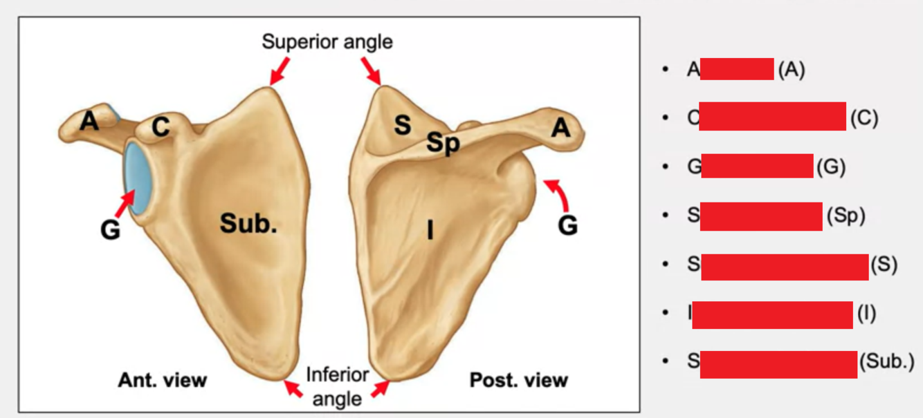Hints: clavicle joint, small hook, socket, ridge of bone, dividing scapula one bigger, and one smaller division, and the anterior surface of the scapula