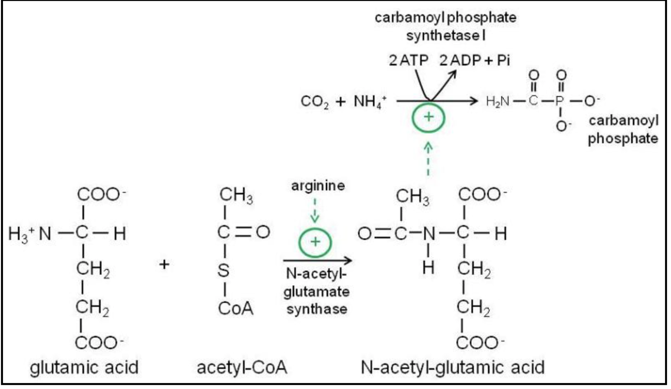 NAG synthase is also stimulated by arginine, which indicates that it is most active when the urea cycle is operating at high efficiency to detoxify ammonia.