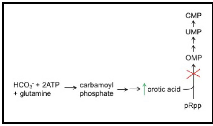 A deficiency in the multifunctional enzyme UMP synthase (shown with the red X in the figure below) leads to elevated levels of orotic acid and reduced amounts of UMP and CMP.