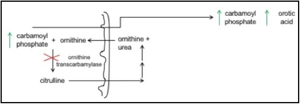 Increased amounts of carbamoyl phosphate exit the mitochondria and stimulate pyrimidine synthesis increasing orotic acids levels, a fraction of which ends up in the urine causing orotic aciduria.