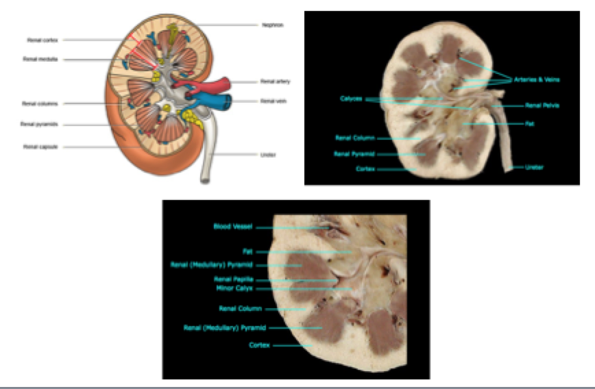 Identify the medulla, cortex, renal pyramids and associated structures within a human kidney