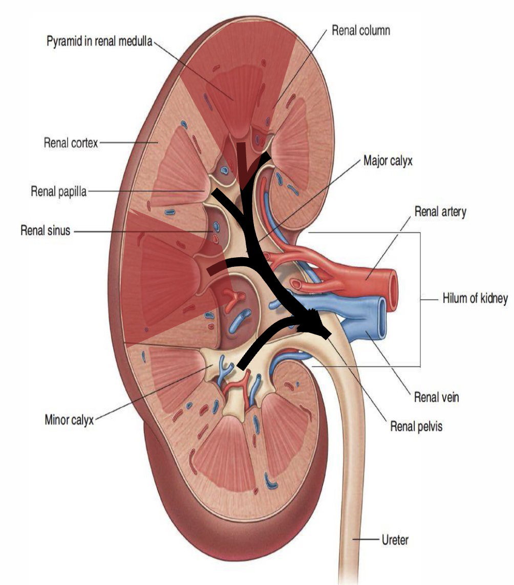 * Emerging from the hilum is the renal pelvis, which is formed from the major and minor calyxes in the kidney