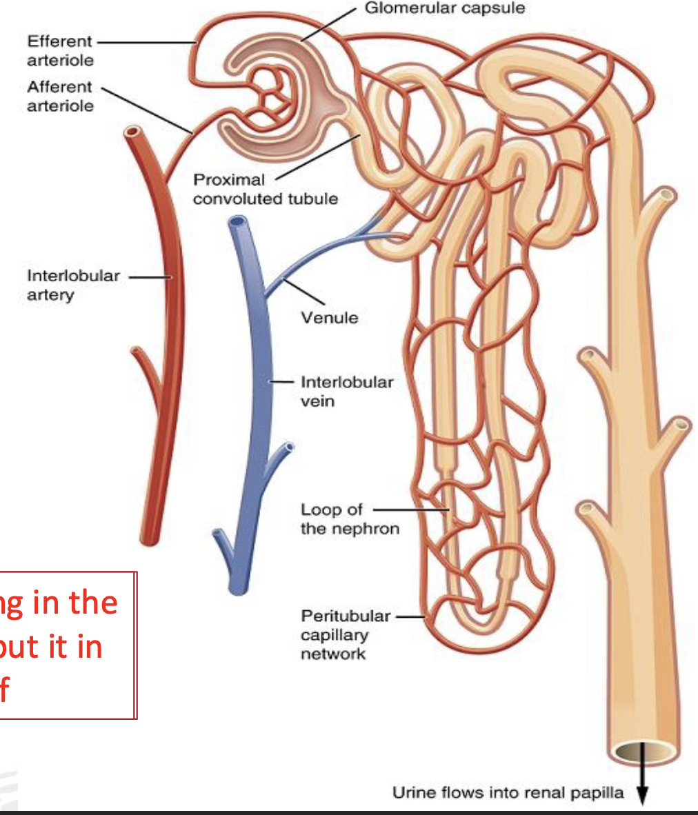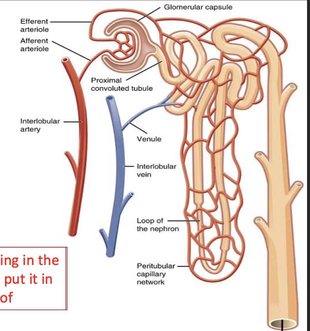 The efferent arteriole then form a capillary network around the more distal portions of the nephron tubule, the peritubular capillaries and vasa recta, before returning blood to the venous system