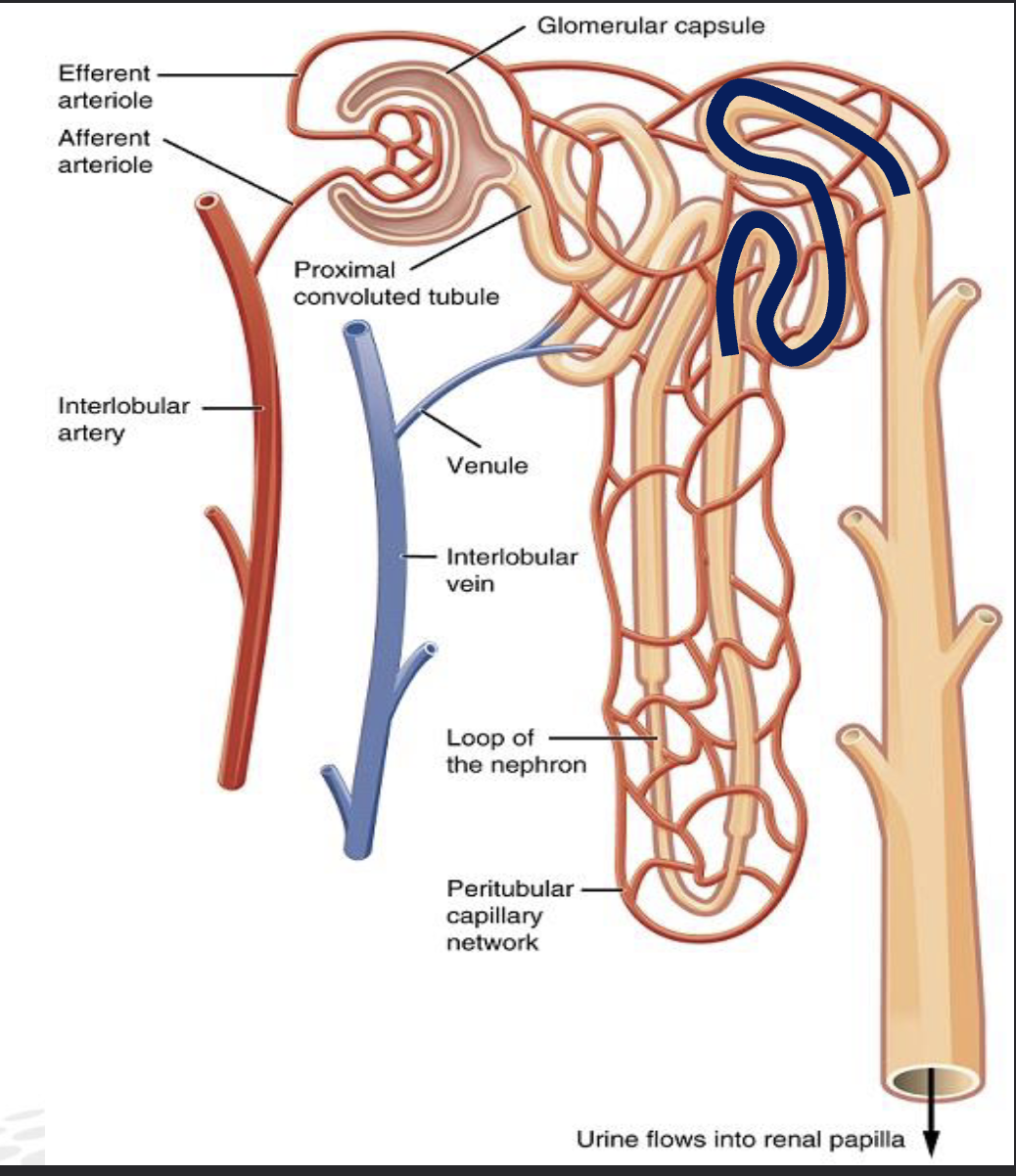 From bowman’s capsule into PCT, formed by simple cuboidal cells which form a brush border. They create a large Surface Area, to maximize reabsorption of Na+, Cl-, and most importantly: glucose