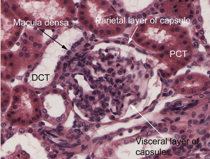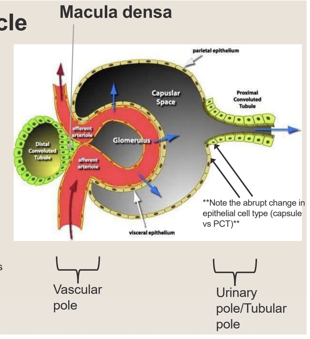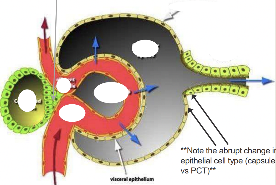Where does the filtrate leave the corpuscle and enter the PCT?