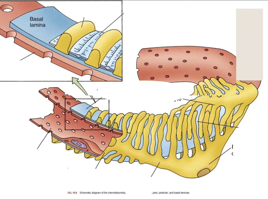 In the __1__ layer of Bowman’s capsule, foot processes known as __2__ extend from the __3__ to completely envelope the __4__ of the capillaries. This forms __5__.