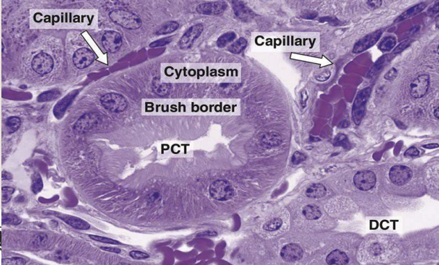The PCT is comprised of what type of epithelium? What feature does it have and why is this?