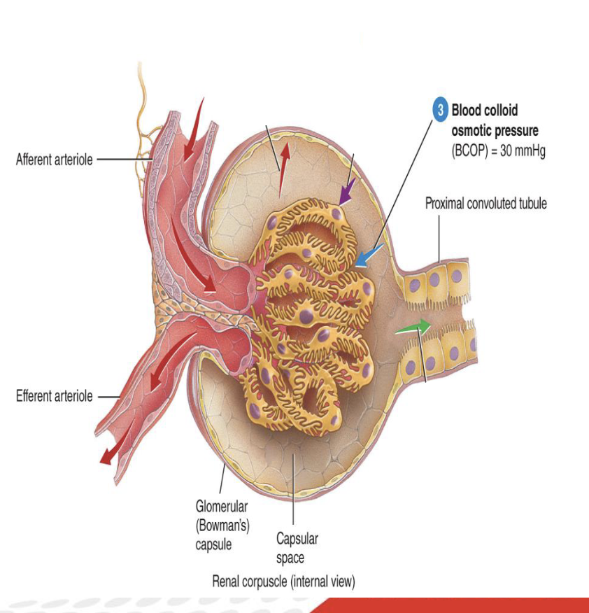 The osmotic pressure inside the glomerular capillary (~30 mmHg) is higher than the osmotic pressure in Bowman’s capsule (~0 mmHg)