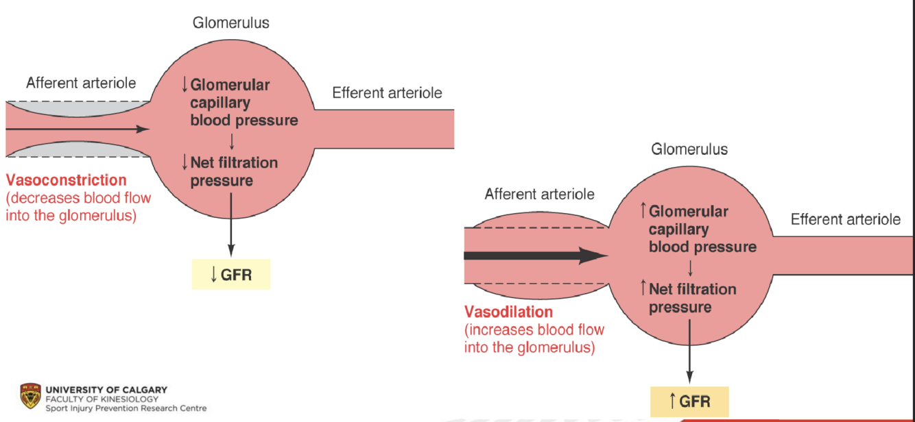 * Sympathetic stimulation increases, the arteriolar smooth muscle constricts (vasoconstriction), resulting in diminished glomerular flow which produces less filtrate