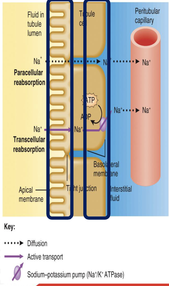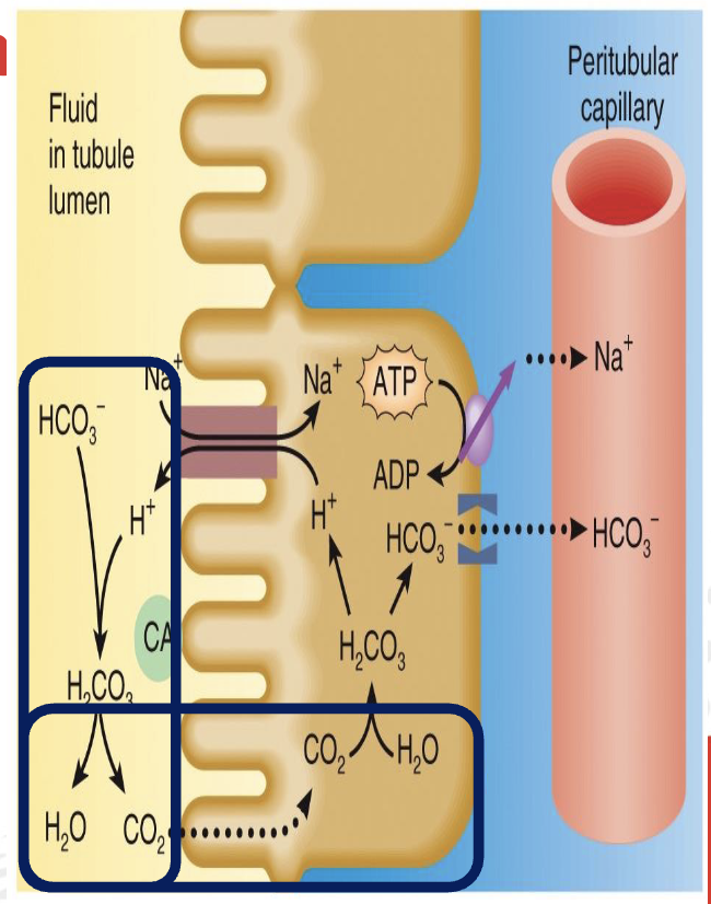 These bicarbonate ions are co- transported with Na+ across the basal membrane to the interstitial space around the PCT