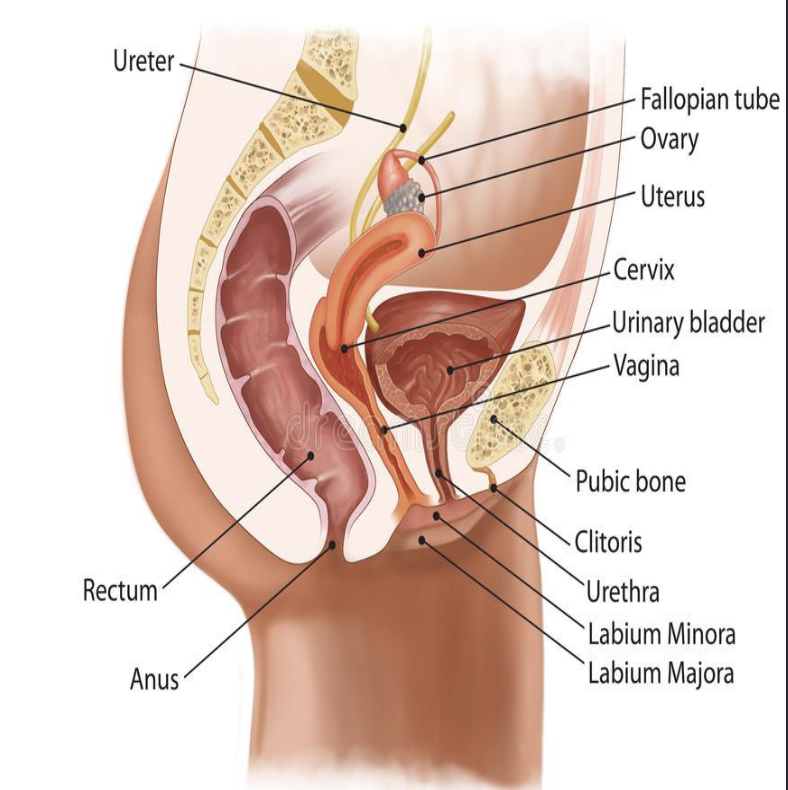 In females, the bladder lies anterior to the uterus, posterior to the pubic bone and anterior to the rectum