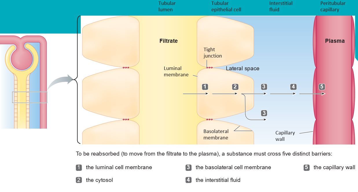 Epithelial cells are either side of the tubular lumen and they provide a parrier to compounds that are in the filtrate from just being absorbed. There are tight junction found in the lateral spaces between tubular epithelial cells which limit the ability of compunds to move in between cells to get into the extracellular fluid from the filtrate. This leaves the transcelular route for reabsorption