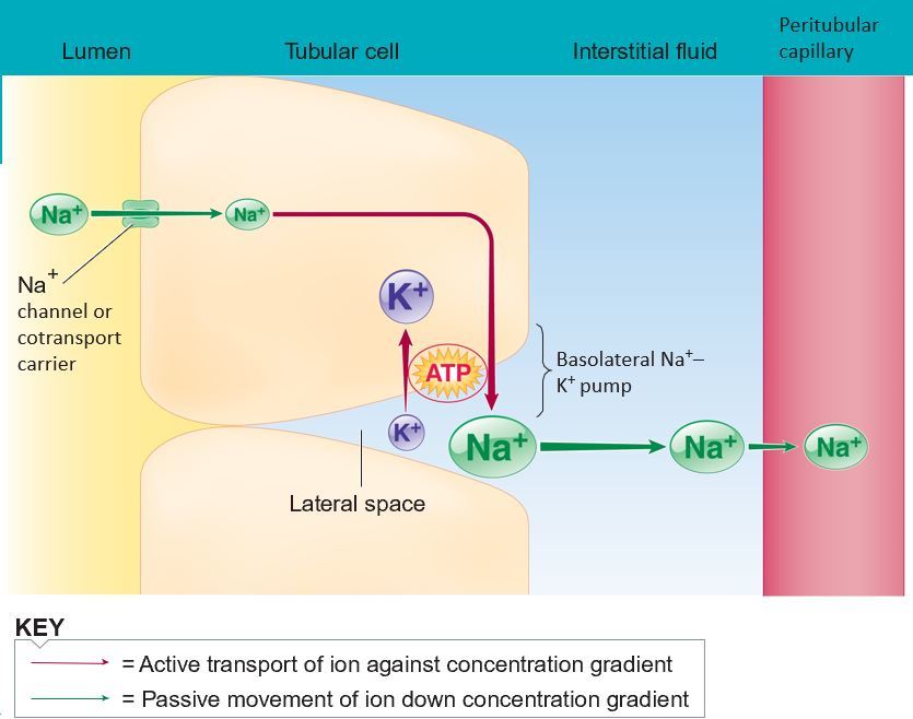 •Na+ reabsorption depends on the Na+–K+ ATPase pump in the basolateral membrane (futhest away from the filtrate)
