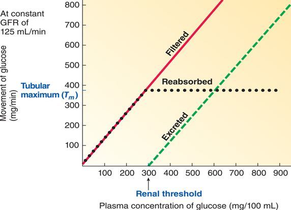 –Tubular maximum for glucose (Tm) is 375mg/min (normally none in urine)