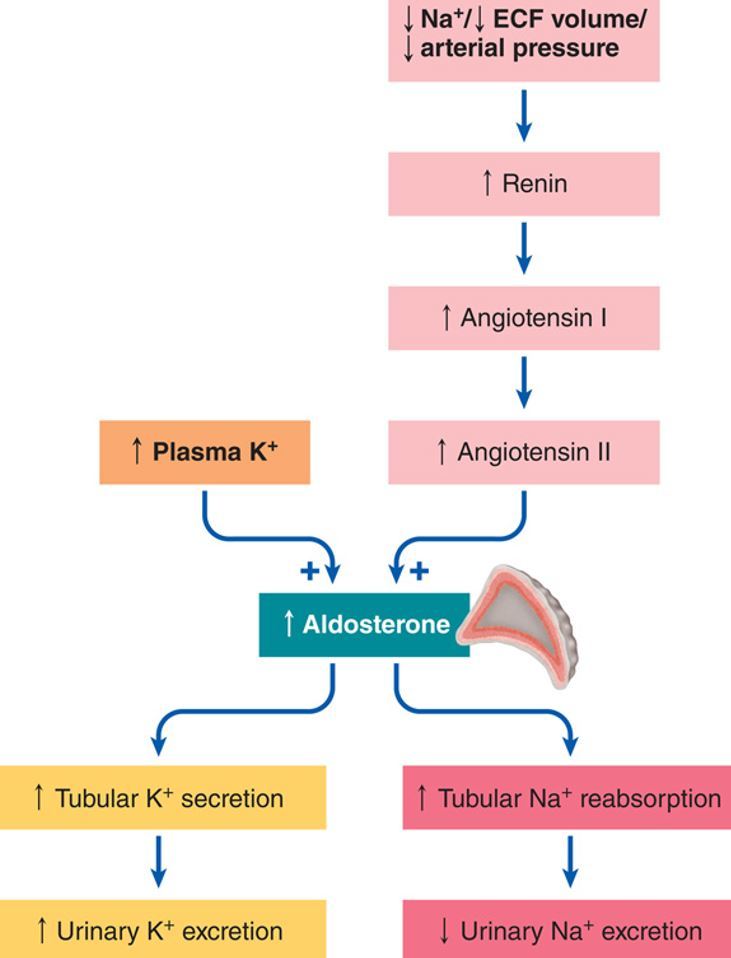 Describe the factors that stimulate and effect the response of aldosterone