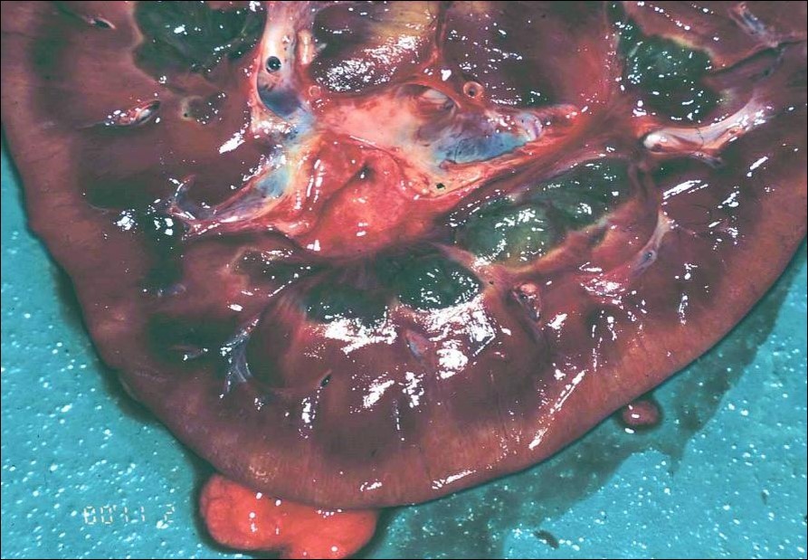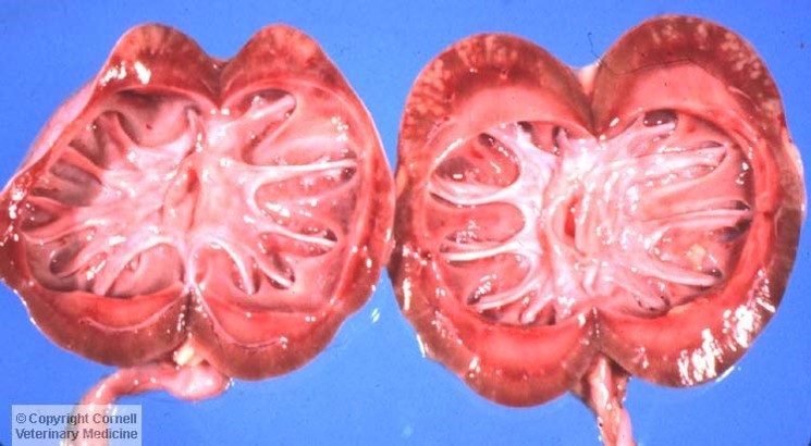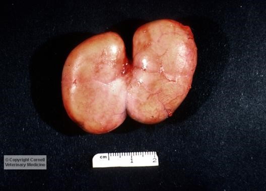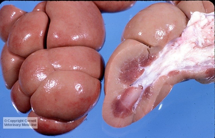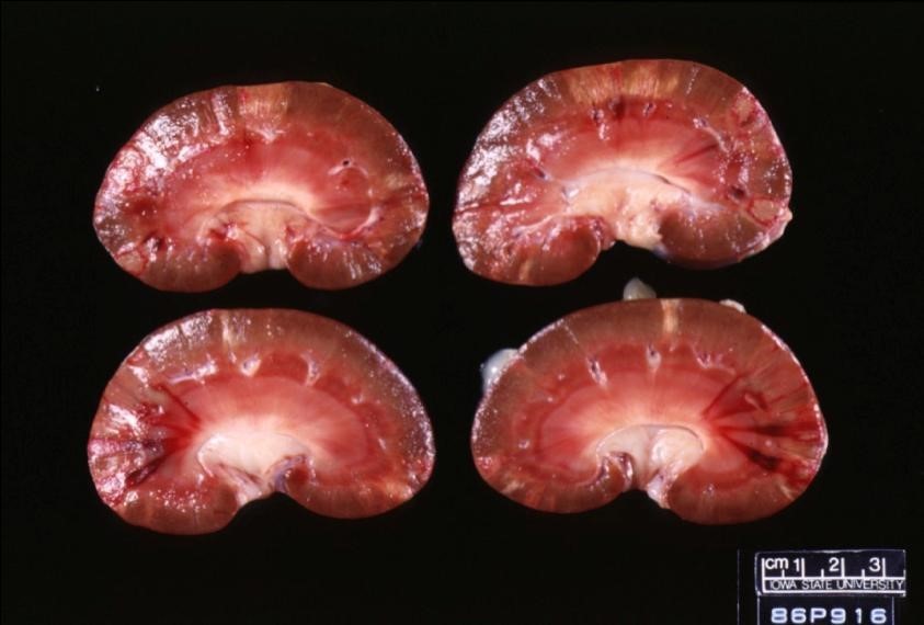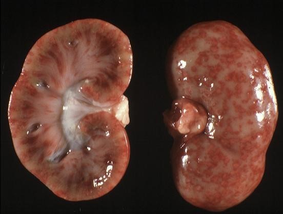Multifocal to coelescing round 2x2mm red lesions found on the kidney surface and penetrating the cut surface (cortex). The kidney appears firm (no-oozing of fluid).