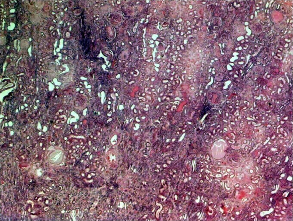 Describe this histo slide of a 2yo cocker with familial renal disease.