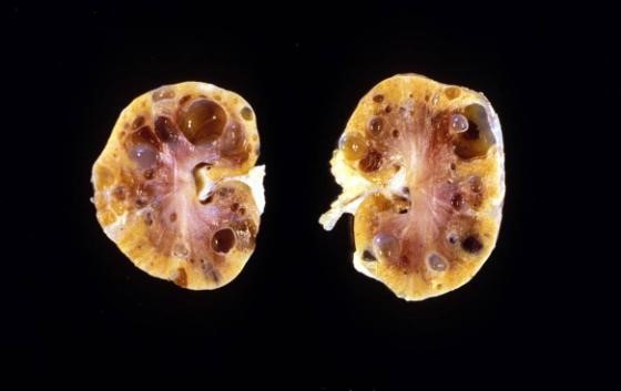 The cortex of the kidney contains multifocal raised round fluid filled nodules of varying sizes (from 2mm to 10mm in diameter). Some of the nodules extend into the medulla.