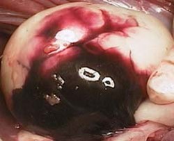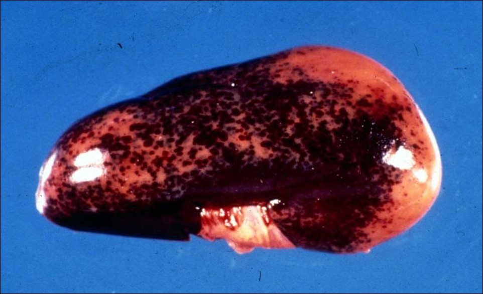 Multifocal to coelescing, round, dark red-black 1x1mm lesions. Coelescing to two large areas (affecting 70% of the tissue).