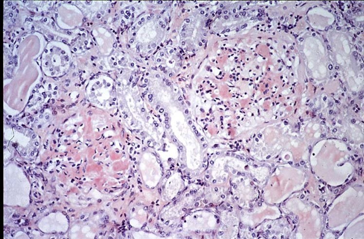 Fibrin and cell debris within tubular lumen. Hypereosinophilic cells w/out nuclei.
