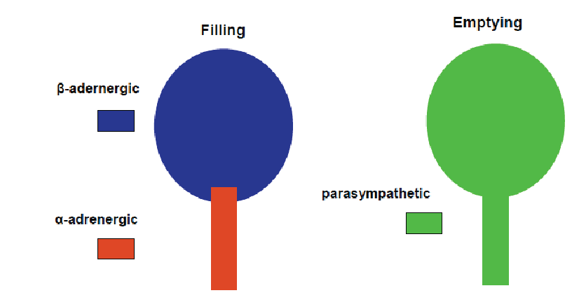 What neuroreceptors are involved in the storage/filling and Emptying of the bladder?