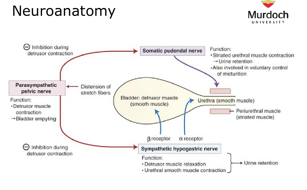 Stretch receptors are activated by distention of the detrusor muscle stimulating the parasympathetic pelvic nerve. This acts on the brainstem to initiate reflex detrusor muscle contraction and inhibition of the pudendal and hypogastric nerves resulting in relaxation of the smooth and striated urethral musclature, permitting urination.