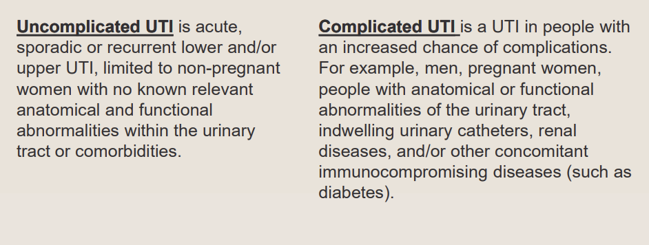 UNCOMPLICATED = acute, sporadic or recurrent lower/upper UTI with none of the features above