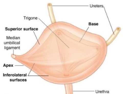 Most anterior element of the pelvic viscera; triangular pyramid with the apex pointing anteriorly