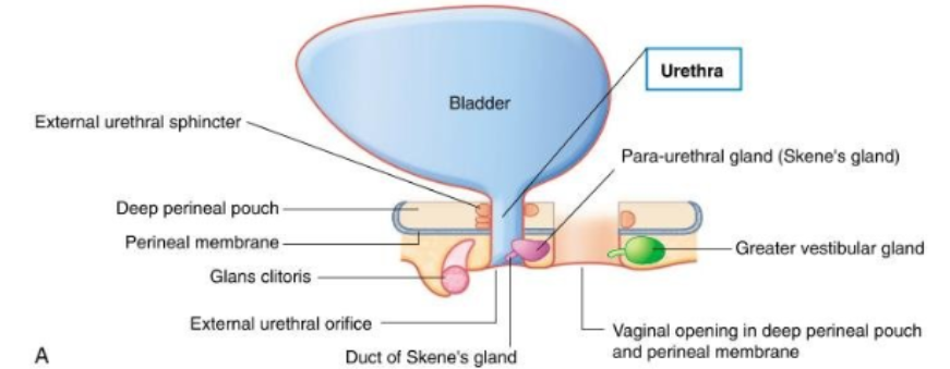 Short urethra, travelling inferiorly through the pelvic floor and deep perineal pouch/membrane to open into the vestibule between the labia minora; small Skene’s (mucous) glands associated with lower end